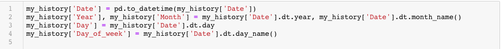 I started first with tinkering around with the date column, first I converted the column in datetime format. This enables us to extract the individual components of a date. I extracted Day, Month, Year, Day_of_week from this date column into separate columns using the to_datetime function of Pandas.