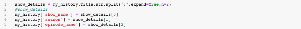 Post this i turned my attention towards Title column. If you notice carefully, entries in the Titles are constructed in this format in the column “Show Name: Season: Episode Name”. Since this pattern is mostly consistent in all the dataset, we can split the string and extract it into 3 seperate columns: show_name, season, episode_name.