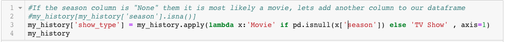 I also noticed, that the title of any Movie that was in the dataset, it only had a Movie Name, which leads me to believe that all the rows where season is Null, it means it is most likely a Movie. Lets create another column which specifies whether its a Movie or a TV Show