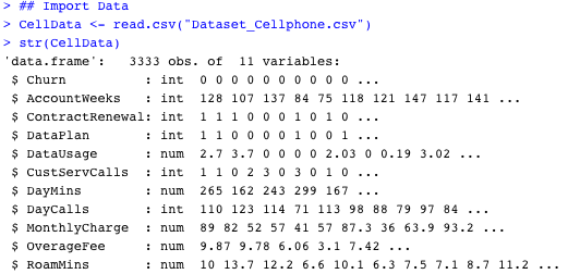As you can notice variables, ‘Churn’, ‘ContractRenewal’, ‘DataPlan’ are all actually factor variables, so lets convert them to factor.