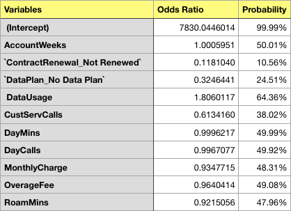 Let’s find out the power of Odds and Probability of the variables impacting on Customer Churn.